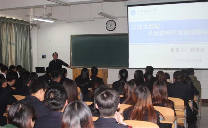 曾教授围绕《工业大数据:从智能制造到智能服务》主题,以实例分析为方法,深刻剖析服务业和制造业的智能变革,引申出大数据对我们生活的影响,同时将智能家居和智能产业的发展穿插进去,内容丰富而精彩,为全体师生奉献了一场内容新颖、信息量大、指导性强的精彩报告。在互动环节,曾教授一一回答了师生的提问,曾教授严谨的治学态度、渊博的学识、清晰的思路、朴实的语言给全体师生留下了深刻的印象。