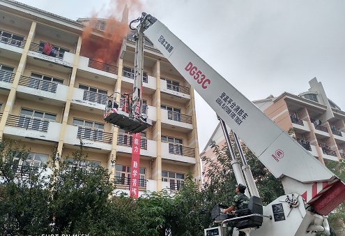 活动伊始,由主持人宣读此次活动的主要内容及注意事项。随后,以生动实例为2018级新生进行消防安全知识培训,并就如何佩戴呼吸面具、使用灭火器、如何进行灭火逃生等环节进行了讲解。之后,参加消防灭火演练的2018级新生在消防战士的指导下进行了消防灭火、逃生实战演练。宿舍楼放置的烟雾弹发出滚滚烟雾,保卫处负责人及公寓管理人员立即组织同学用湿毛巾捂住口鼻,快速、有序从逃生口撤离到安全地点。滨州市消防支队的消防车到达现场,多条水龙立刻喷向“着火点”,“火情”得到控制。消防人员搭起拉梯,设置逃生绳索,并迅速启动登高车对高层被困学生进行救助。经过全体人员奋战,“大火”最终被扑灭。