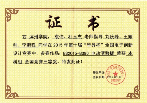 自2007年我院教师就积极指导学生参加该项赛事,并取得不错的成绩。为提高学生的创新能力、动手能力,我院采取自愿报名、笔试选拔等形式从大二开始,给学生提供电子设计方面软硬件知识培训。为此,我院成立了电子创新实验室,供学生学习电子设计使用。近五年来学生获奖情况如下: