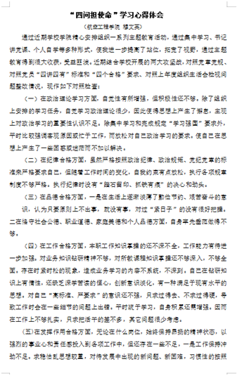 会前,每位党员老师按要求撰写了上阶段的学习心得体会。会上,每位党员老师聚焦学校两大攻坚战,对照党章党规、对照党员“四讲四有”标准和“四个合格”要求、对照上年度组织生活会检视问题整改情况,结合自己的本职工作,开展问岗位职责是什么、问实绩实效如何、问差距短板在哪里、问怎么改怎么干“四问担使命”学习讨论,深刻检视并进行了反思。每位党员发言后,大家进行了热烈的讨论。大家纷纷表示要讲政治、有信念,讲规矩、有纪律,讲道德、有品行,讲奉献、有作为,做“四讲四有”的合格党员。