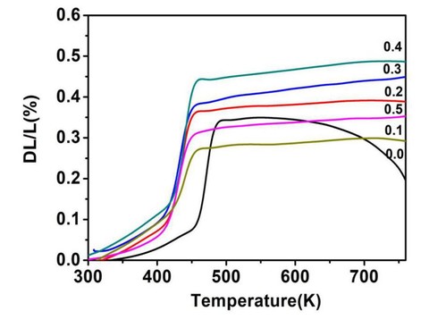 从ZrxAl2-xMo3-xVxO12 (x=0.0, 0.1, 0.2, 0.3, 0.4,0.5)的膨胀系数曲线可以看出随着离子掺杂浓度的增大材料在宽温区内均表现出优异的低膨胀特性(图1),热膨胀曲线是平滑的线性,没有发生突变现象,说明通过离子掺杂改善了材料的吸水性。