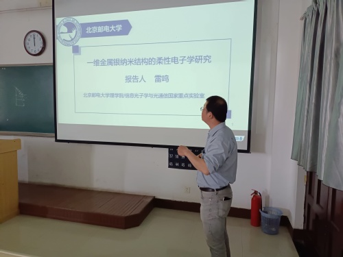 雷鸣教授是北京邮电大学理学院/信息光子学与光通信国家重点实验室教授,博士生导师,本次以“一维金属银纳米结构的柔性电子学研究”为主题,首先介绍了柔性电子学相关概念,介绍了柔性电子学的背景与意义。其次,雷教授结合自己的工作主要介绍了柔性电子学在柔性透明电极、红外反射、电磁屏蔽材料、脑机接口四个方面的应用,以及取得的成果。在报告会最后,雷教授和现场师生进行了互动交流,耐心解答了老师和同学们提出的专业问题。 通过本次报告会,让我院相关专业的教师和学生对本专业有了更全面深入的理解,激发了学生的学习兴趣。增强了我院教师为学校转型发展、学院专业建设贡献青春力量的责任感和使命感,同时也增强了学生的专业自信心和自豪感。