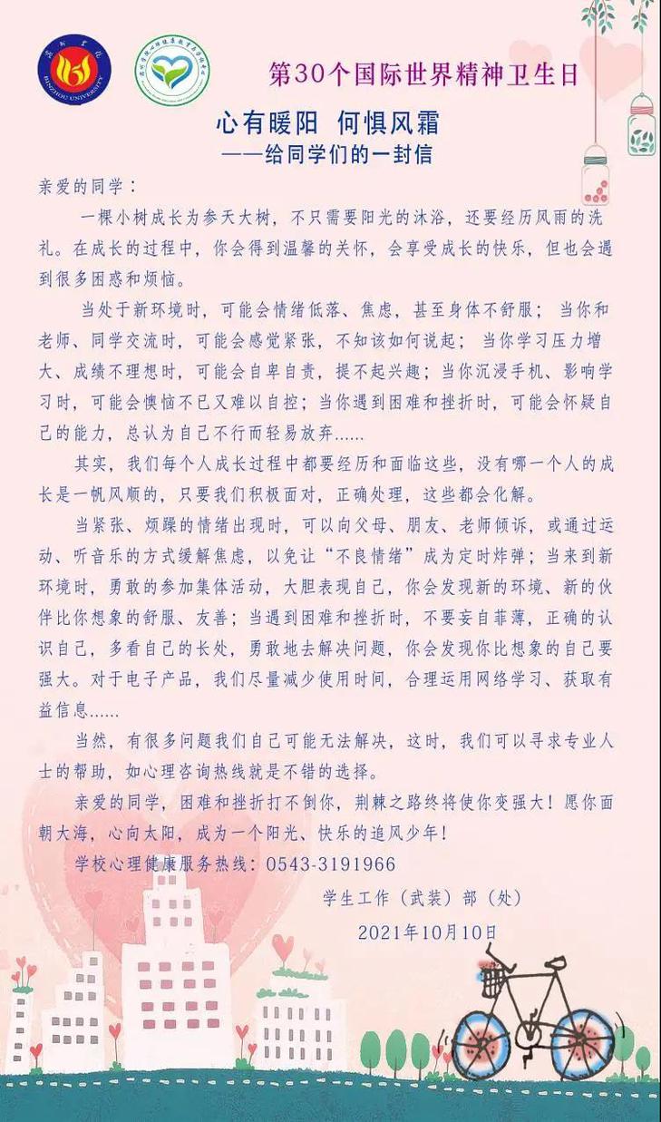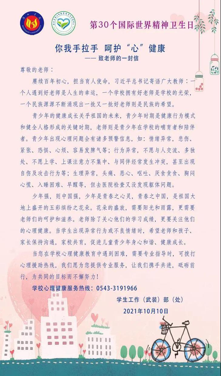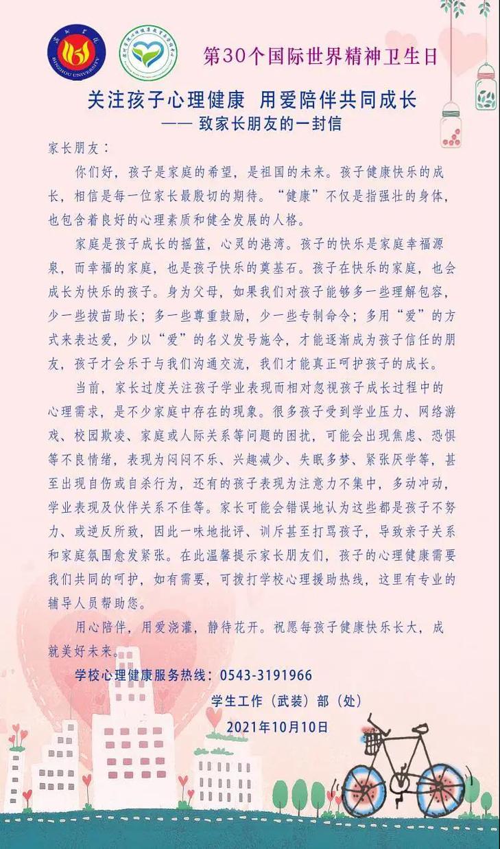 每年的10月10日是“世界精神卫生日”。我国2021年世界精神卫生日主题为“青春之心灵 青春之少年”,旨在通过多种途径的宣传教育,帮助儿童青少年掌握心理健康相关知识,提升心理调适能力;协助家长树立科学的教育理念,帮助孩子正确认识、处理碰到的情绪问题;号召各级政府部门、学校、医疗卫生机构、社区、社会组织等多方力量加强合作,共同创造更有利于青少年心理健康的外部环境。