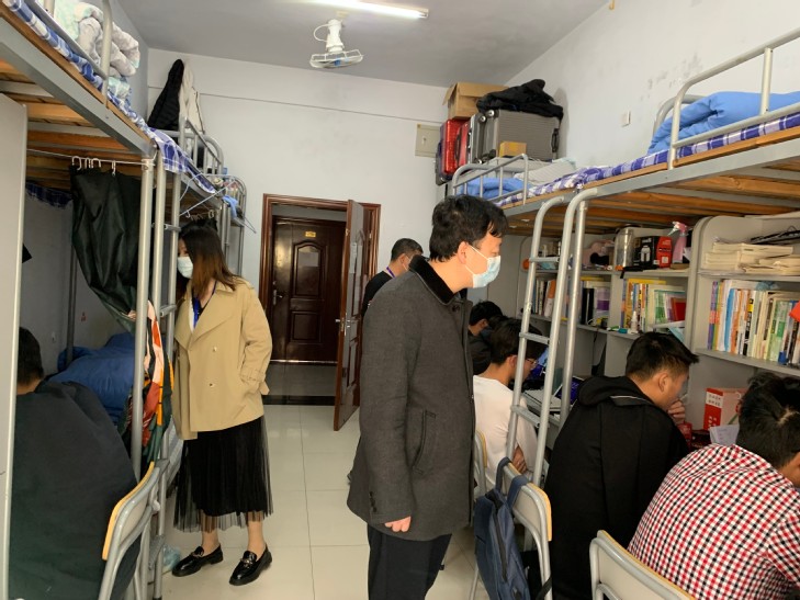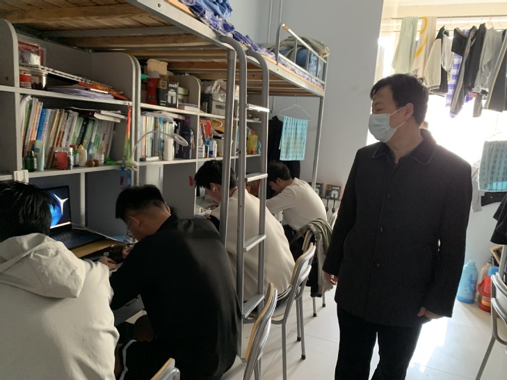 走访过程中,陈立刚院长带领辅导员老师实地查看了学生线上听课情况,学生利用手机、平板、电脑等设备认真听课,积极与老师互动,课堂秩序井然有序;在课间,陈院长仔细向同学们询问线上学习期间网络和设备是否存在问题,任课教师备课是否充分,教学资源运用是否合理,与学生互动、为学生答疑解惑是否及时。与此同时,陈院长围绕在疫情管控的特殊时期学生思想和心理动态,生活需求等与同学们进行了亲切交流,他鼓励大家树立积极向上的生活理念,积极响应、配合学校各项疫情防控政策,共克时艰,共同迎接战“役”胜利的时刻。