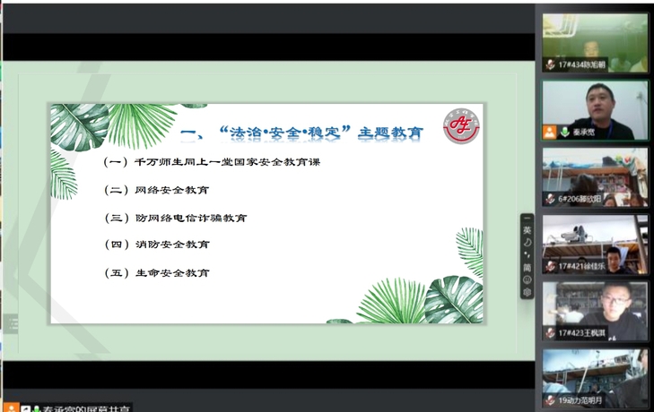 为进一步在学生中开展法治安全教育,确保安全意识入心入脑。英国365集团于4月17日晚分年级开展“法治•安全•稳定”线上主题教育活动,年级辅导员主持活动。