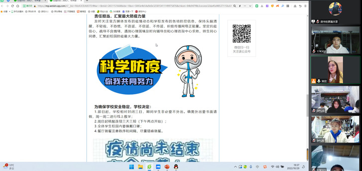 会上,辅导员老师结合国家和学校关于网络安全和网络管理的相关文件和法律法规,引用近期学校发生的热点案例,强调网络不是法外之地,并倡议同学们通过正确的渠道合理表达诉求,正确使用网络工具,做到依法上网、安全上网、理性上网、文明上网、适度上网,养成崇德向善、诚实守信、健康文明的网络行为习惯,共同营造一个安全、文明、健康的网络空间。随后,辅导员老师领学了学工处下发的《滨院人,快来看!关于疫情防控形势的重要提醒》,讲清当前疫情防控的严峻形势,引导同学们深刻认识防疫工作的重要性。同时,通过高校疫情防控警示案例讲解宣传学校的疫情防控要求,学习疫情防控期间学习生活健康指南,引导同学们积极调整个人心态,主动适应疫情背景下的学习节奏和生活方式。最后,辅导员老师还针对网络电信诈骗、宿舍安全卫生等问题进一步作了强调和说明。