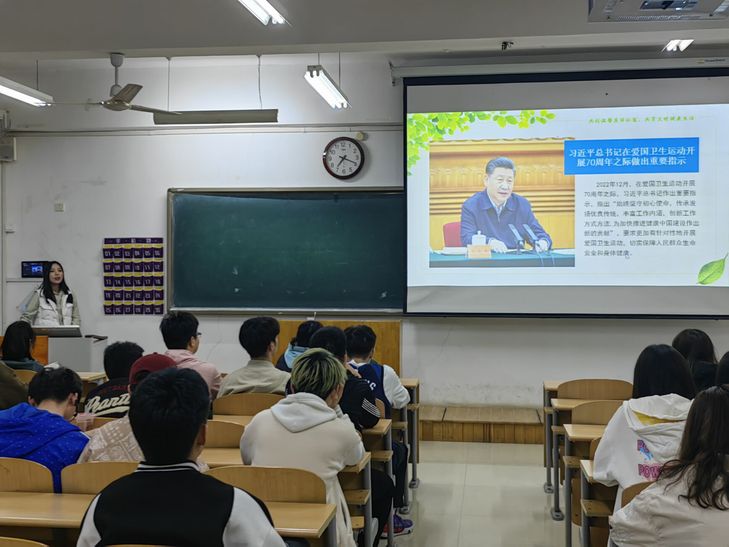班会上,班主任老师结合习近平总书记在爱国卫生运动开展70周年之际做出的重要指示,详细讲解了“什么是爱国卫生运动”“爱国卫生运动开展以来取得的辉煌成就”“新时代开展爱国卫生运动的重大意义”以及“新时代大学生如何践行爱国卫生运动精神”,引导广大学生积极参与爱国卫生月运动,树立文明健康、绿色环保的健康理念;班主任老师围绕“文明健康 绿色环保”为主题的PPT,用详实的案例、生动的语言,为同学们讲述了文明绿色环保生活方式、生态环保知识、生态环境与健康素养等内容,从衣食住行到节能减排再到生态文明理念落实,用简单易懂、流畅易记的语言,传递了文明健康绿色环保生活的科学内涵和长远意义;通过观看爱国卫生月宣传教育片、环保知识问答等多种形式学习绿色环保、垃圾分类等知识,树立绿色环保观念,弘扬文明健康的良好风尚。