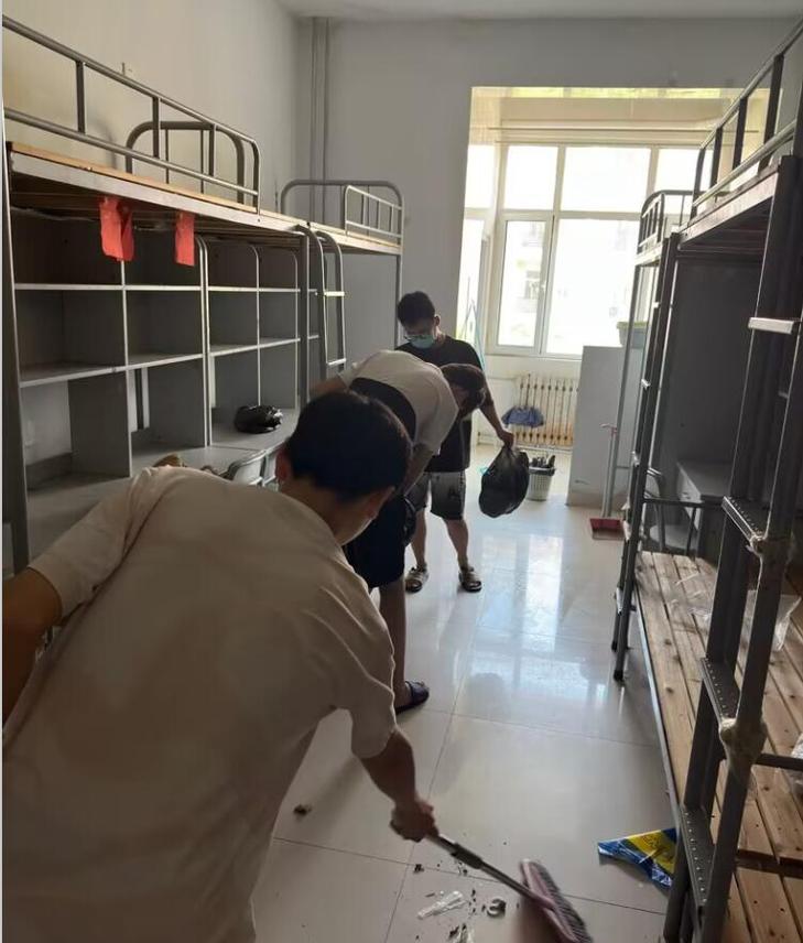 活动开始前,学生党员按照活动分组,领取卫生清洁工具,然后深入学生公寓6号楼和17号楼的毕业生宿舍开展寝室清洁活动。各小组在负责人的带领下,对负责的区域进行了清扫,不放过任何一个卫生死角,针对厕所、玻璃门卡槽等重点区域进行了全面清洁。清扫毕业生宿舍期间,党员学生们对离校毕业生遗留的物品进行分类清理,有序运送到生活垃圾集中回收点。每位同学分工明确、密切配合,将宿舍地面、桌面进行清洁。从阳台到洗手台,从书柜到书桌,每一个地方都打扫的细致入微。学生们将寝室中床上物品、衣物、书本、纸箱等可回收物品,一起打包进行合理堆放,方便后续回收。不可回收类垃圾则彻底清扫,保证寝室环境的干净整洁。志愿服务结束后,学生党员们克服高温天气,认真高效完成清洁工作,使得毕业生宿舍整洁有序、焕然一新。