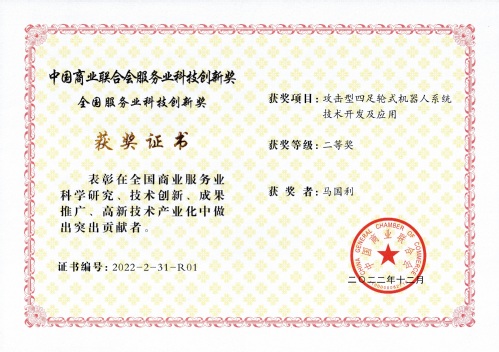 近日,中国商业联合会主办的2023年全国商业科技质量大会在北京召开。我院马国利教授领衔完成的研究成果“攻击型四足轮式机器人系统技术开发及应用”荣获中国商业联合会服务业科技创新奖二等奖。