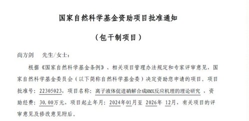 近日,2023年度国家自然科学基金项目评审结果公布,我院尚方剑博士获得国家自然科学基金青年项目资助,项目名称为《离子液体促进硝解合成HMX反应机理的理论研究》。