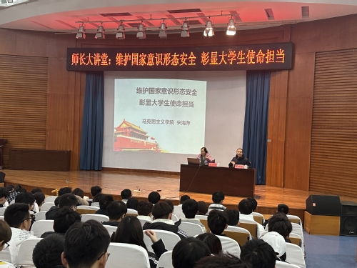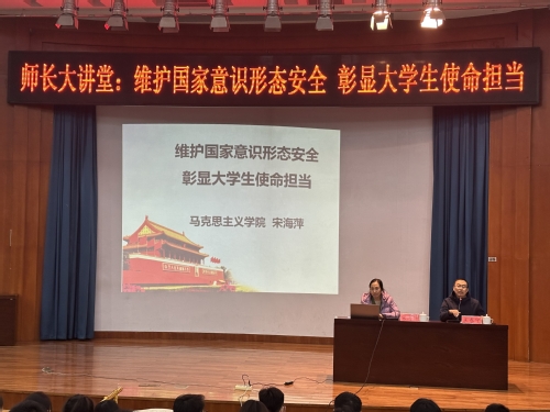 会上,宋海萍以“维护国家意识形态安全 彰显大学生使命担当”为主题,围绕“什么是意识形态?”、“什么是意识形态安全?”、“大学生如何维护国家意识形态安全?”等问题展开论述,在定义上区分了主流意识形态与非主流意识形态,明确以马克思主义为核心内容和理论指导的社会主义意识形态是中国的主流意识形态,她从维护国家意识形态安全重要性出发,强调意识形态工作事关党的前途命运,事关国家长治久安,事关民族凝聚力和向心力。最后,宋海萍从夯实学业基础、树立马克思主义信仰、抵制非主流意识形态不良影响三方面倡导同学们自觉维护国家意识形态安全,肩负起新时代青年的使命担当,希望与会师生挺起脊梁,不怕斗争、敢于斗争,切实维护好国家主权、安全、发展利益。