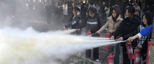 在正式演练前,消防科王亮亮提前为同学们做好安全教育,说明火灾逃生的基本常识,讲解本次演练注意事项及疏散逃生路线,要求同学们注意纪律、严肃对待、听从指挥、实战演练,不要在疏散途中嬉戏打闹,以确保本次消防演练活动顺利完成。随着警报声响起,模拟烟雾弥漫,演练正式开始。在辅导员和保卫处老师的指挥下,同学们迅速做出反应,沿着规划路线有序撤离现场,他们用毛巾捂住口鼻,弯腰垂头,全力奔跑,有序撤离到安全区域。到达集合地点后,消防科工作人员迅速整队并进行了人数清点和统计,我院学生在规定时间内全部完成撤离。在活动最后,消防科李俊对演练过程中存在的问题进行点评,讲解并示范手提式干粉灭火器的正确操作方法。掌握使用方法后,同学们按照一提二拔三握四对五喷的动作口诀,亲身参与到灭火实践中。