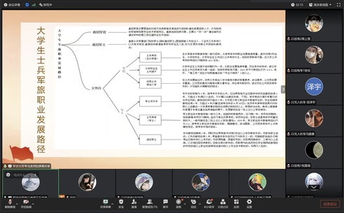 会上,宫欣老师借助屏幕共享功能,以图文结合的方式系统解析了专科生入伍的优惠政策。针对无人机专业特性,她重点阐释了“定向军士选拔”“技能人才直招”等专项政策,并对比展示了入伍学生在部队晋升、学历提升及就业创业等方面的差异化优势。结合某战区无人机分队招聘案例,强调学生可通过“专业技能+军事训练”实现军地两用发展。会上还展示了近几年优秀毕业生征兵入伍的优秀事迹,激发了广大同学的参军热情,引发评论区热烈讨论。