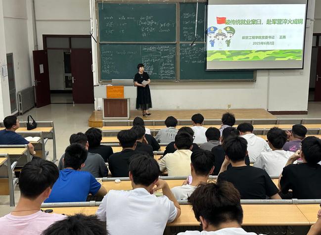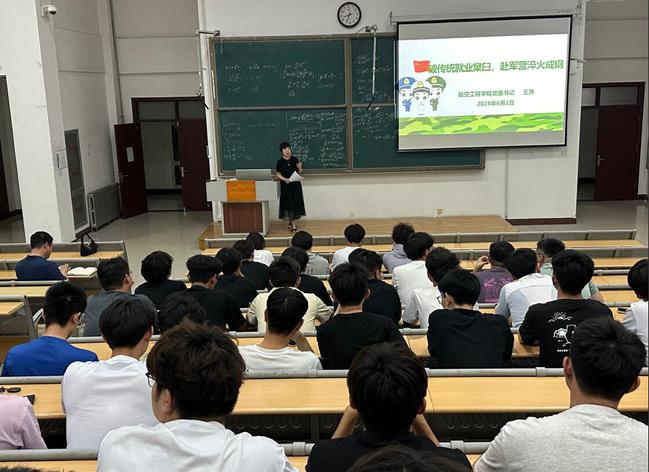 学院党委书记以“破传统就业窠臼,赴军营淬火成钢”为题,围绕大学生普遍关注的参军入伍形势政策,结合国家大力发展低空经济背景下部队对专业技术人才的需求状况,以详实的数据和入伍大学生的典型成长案例,为现场同学解读了征兵政策、军士成长发展路径,厘清了关键信息,帮助大家算好了参军入伍的政治账、经济账、家庭账、成长账和前途账。她在报告中指出,参军入伍是青年学生淬炼品格的绝佳熔炉,更是国家赋予大学生的宝贵机遇,而对毕业生而言,“入伍更是高质量就业”,是将青春担当与家国情怀有机融合的新途径。她希望青年学生以军人为榜样,将个人理想融入强军强国伟业,积极投身军营,用热血书写壮丽的青春篇章。她希望航院学子不断践行航空报国精神,发挥专业优势和特长,以更加饱满的政治热情和高度的爱国情怀投身国防建设事业,展现新时代航院学子勇担使命、善作善成的青春荣光。