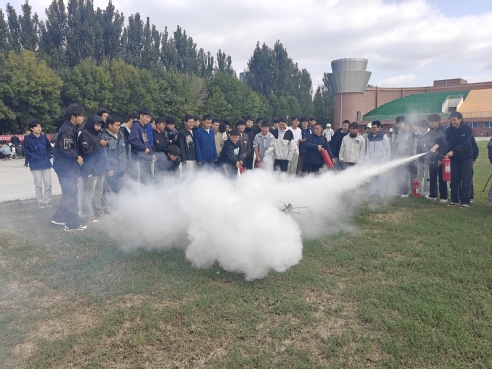 培训现场,杨玉杰以近年来高校典型火灾案例为切入点,通过数据分析,深入浅出地讲解了火灾成因、预防措施及初期火灾扑救方法。他特别强调了宿舍用电安全、易燃物品管理、疏散通道畅通等校园消防重点,并现场演示了灭火器、防烟面罩等消防器材的正确使用步骤。理论学习后,保卫处工作人员组织新生进行实践操作。在灭火实操区,面对熊熊燃烧的树枝,同学们跃跃欲试。工作人员首先演示了干粉灭火器的正确使用方法,引导新生按照“提、拔、握、压”的灭火器操作口诀操作,强调了站在上风方向、对准火焰根部喷射等要点。在确保安全的前提下,新生代表们轮流上阵,亲身体验了扑灭“初起火灾”的过程,成功将理论知识转化为实战技能。