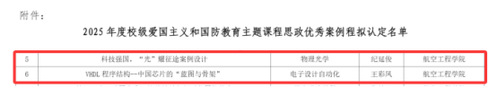 近日,学校2025年度爱国主义和国防教育主题课程思政优秀案例评选结果正式公布。经教师自主申报、学院择优推荐、校级专家评审、学校审核及公示等多轮严格遴选,我院纪延俊教授的《科技强国,“光”耀征途案例设计》与王彩凤教授的《VHDL程序结构——中国芯片的“蓝图与骨架”》凭借鲜明的主题导向、创新的设计思路和扎实的育人实效,成功入选校级优秀案例,充分彰显了我院在课程思政建设与爱国主义教育、国防教育融合实践中的突出成效。