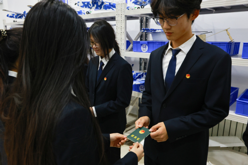 仪式在庄严的国歌声中拉开帷幕。随后,刘君君宣读了新团员名单,当56名新团员依次上前,从老团员手中接过团员证、团徽的那一刻,现场响起热烈掌声,这不仅是身份的传递,更是责任的交接。在鲜红的团旗前,全体团员举起右拳,由24无人机2刘家豪领誓,庄严宣誓:“我志愿加入中国共产主义青年团,坚决拥护中国共产党的领导……”铿锵有力的誓言回荡在无人机研制与实训中心内,与陈列的无人机实训设备交相呼应,让新团员在航空专业特色氛围中,深刻感受到加入共青团的光荣使命。宣誓结束后,新团员代表24无人机3张晶晶发言,她表示将以入团为新起点,牢记誓言,勤奋学习航空专业知识,积极参与实训实践,努力成为有理想、敢担当、能吃苦、肯奋斗的新时代共青团员。党员代表23动力本1庞祥艺则分享了自身成长经历,鼓励新团员珍惜团员身份,在专业学习和集体生活中发挥先锋模范作用。最后,赵望锋作总结讲话。他结合无人机研制与实训中心的专业育人定位,对新团员提出三点要求:一是要坚定理想信念,把个人理想融入航空强国建设的国家需求中;二是要深耕专业学习,依托实训中心的优质资源锤炼过硬本领;三是要践行团员义务,在志愿服务、专业实践中传递青春正能量。
